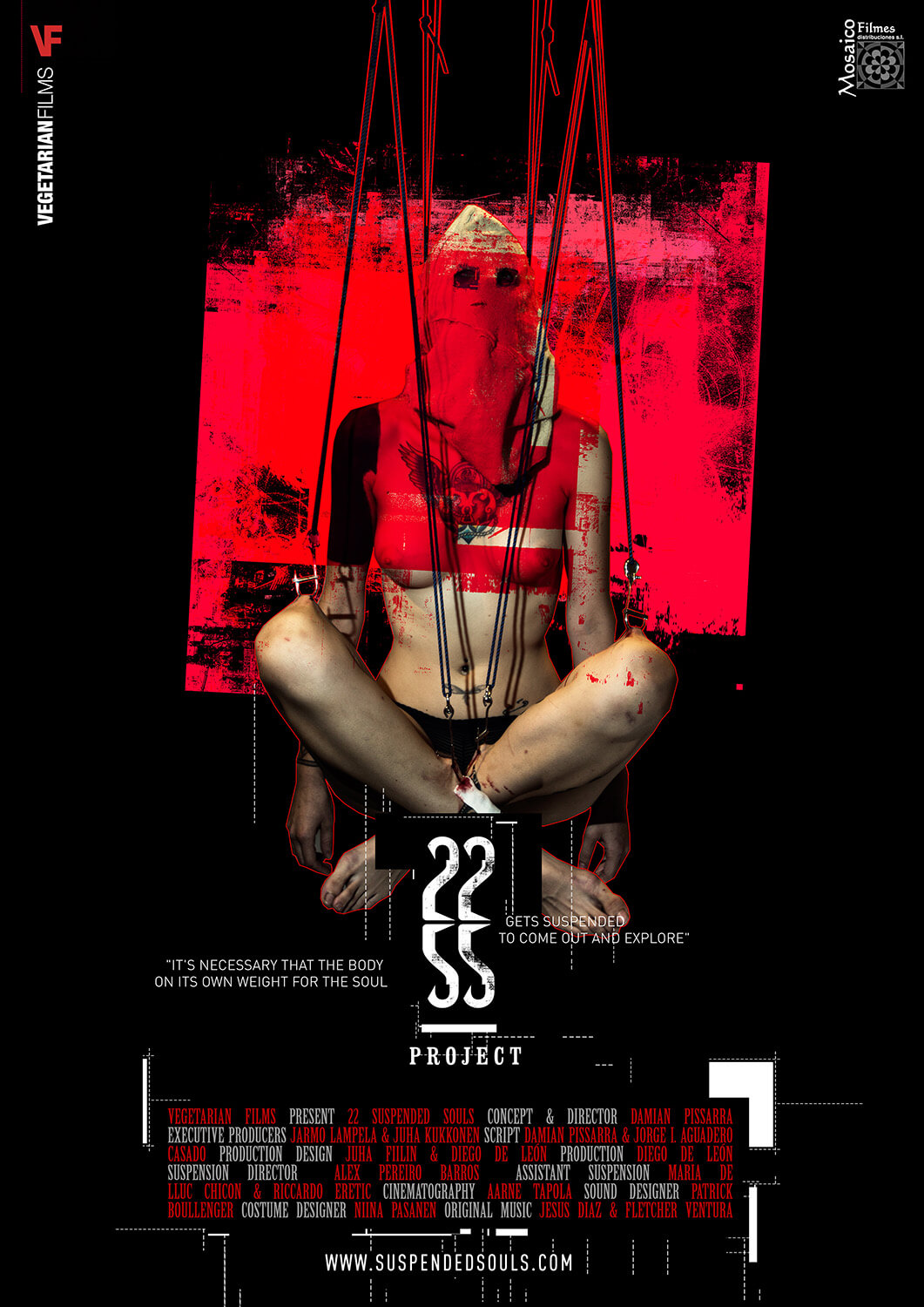 22 Suspended Souls es un largometraje documental que nace del proceso de creación de una obra cinematográfica y se transforma en una experiencia única e irrepetible. El documental relata el rodaje de una de las escenas más extremas y significativas de la película de ficción homónima: la suspensión corporal simultánea de 22 personas, un acontecimiento sin precedentes hasta el momento de su realización.